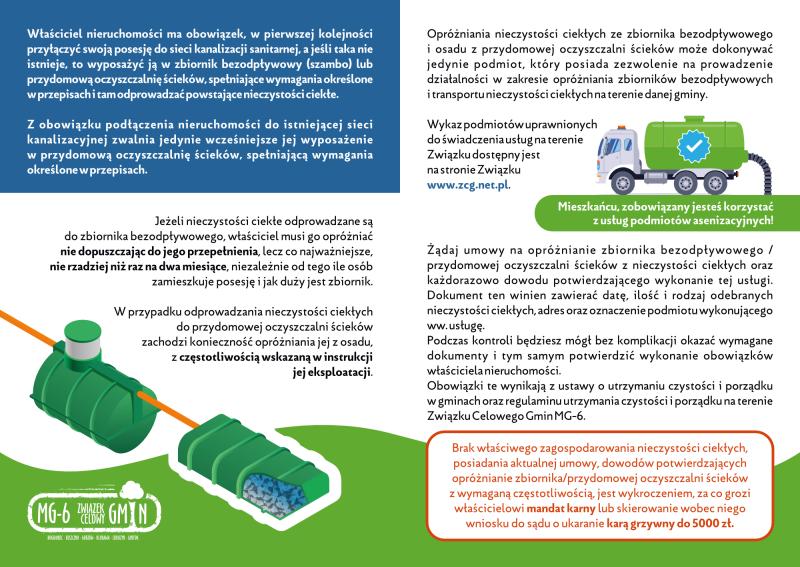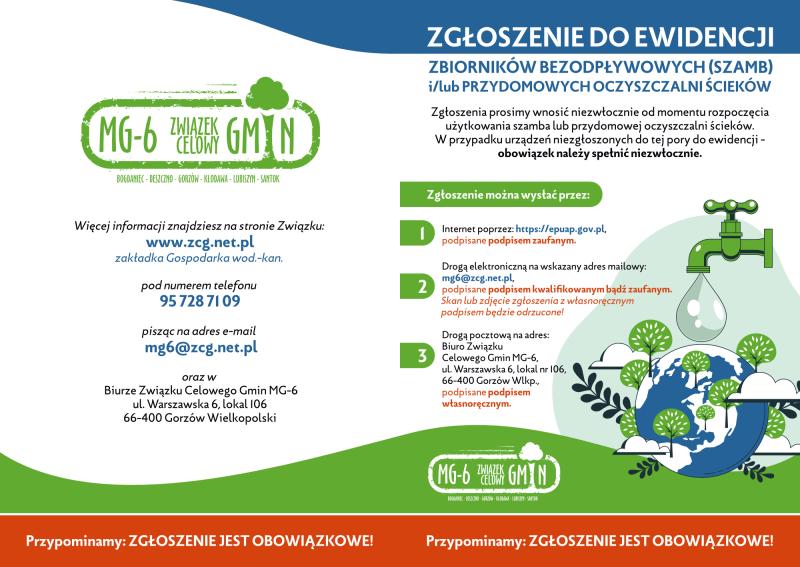 W przypadku, gdy nieruchomość nie posiada możliwości podłączenia do kanalizacji sanitarnej, właściciel ma obowiązek wyposażenia jej w zbiornik bezodpływowy lub przydomową oczyszczalnię ścieków, które to należy zgłosić do ewidencji prowadzonej przez Związek Celowy Gmin MG-6. Druk zgłoszenia można pobrać ze strony Związku lub w jego biurze znajdującym się w Gorzowie Wlkp. przy ul. Warszawskiej 6, lokal 106.